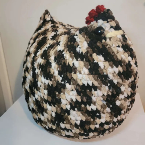 Handcrafted with luxurious plush yarn in warm earth tones, Mama Chonky is perfect as a cuddle buddy, quirky décor item, or the crown jewel of your handmade hen collection. With her signature red comb and soulful eyes, she rules the roost in style!